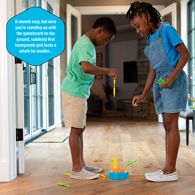 Each player gets six arrows in one color. Taking turns, they have to put their spatial reasoning skills to the test as they try and drop their arrows into the honeycomb gameboard.