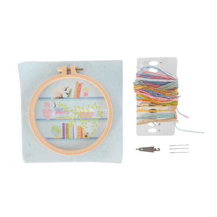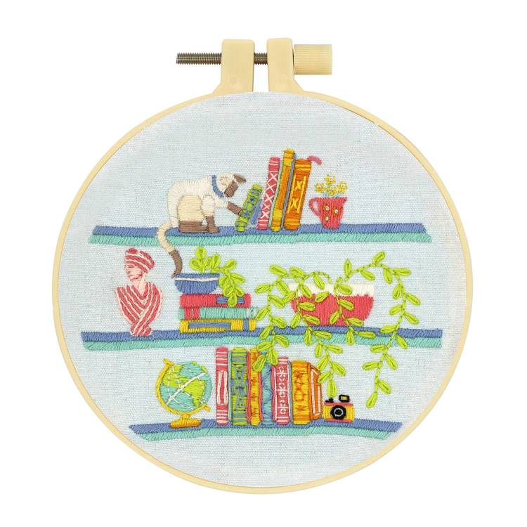 A charming embroidery project celebrating cozy shelves, plants, and the love of books. This all-in-one kit includes everything needed to complete the design, from hoop to floss. A great gift or addition to any DIY collection.