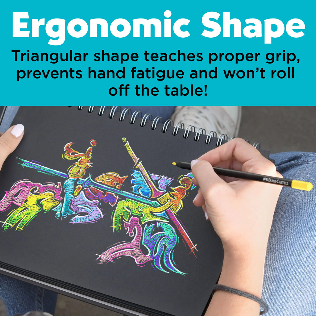 The ergonomic triangular shape of the pencils automatically ensures the correct grip position for optimum comfort while drawing, and prevents hand fatigue when coloring. Additionally, the pencils will not roll off of or away from the work surface.