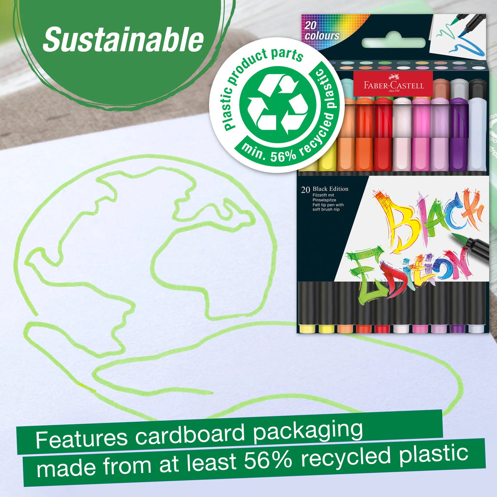Faber-Castell works on reducing plastics or replacing them with recycled materials. The felt tip markers are made of a minimum of 56% recycled plastic. They come packaged in a recyclable cardboard box and can be stored horizontally or vertically.