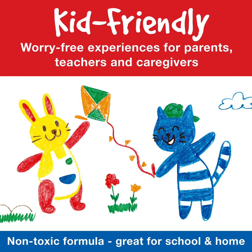 Hands remain clean and colors wash out of most fabrics for peace of mind and easy cleanup.