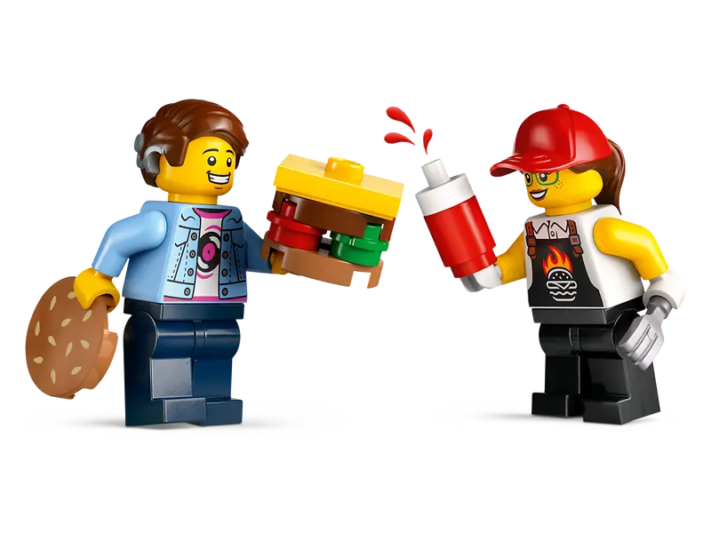 - What’s in this toy vehicle building set? – Everything kids need to construct a burger truck a vendor minifigure and a customer minifigure with a cochlear implant, plus LEGO® condiment accessories