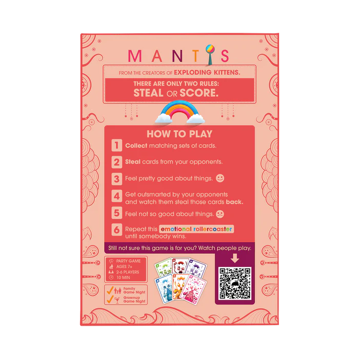 There are only two rules: Steal or Score. You collect matching sets of cards by stealing from your opponents. You feel good about things, then not so good about things as opponents steal your cards back. Repeat this emotional rollercoaster until somebody wins the game.