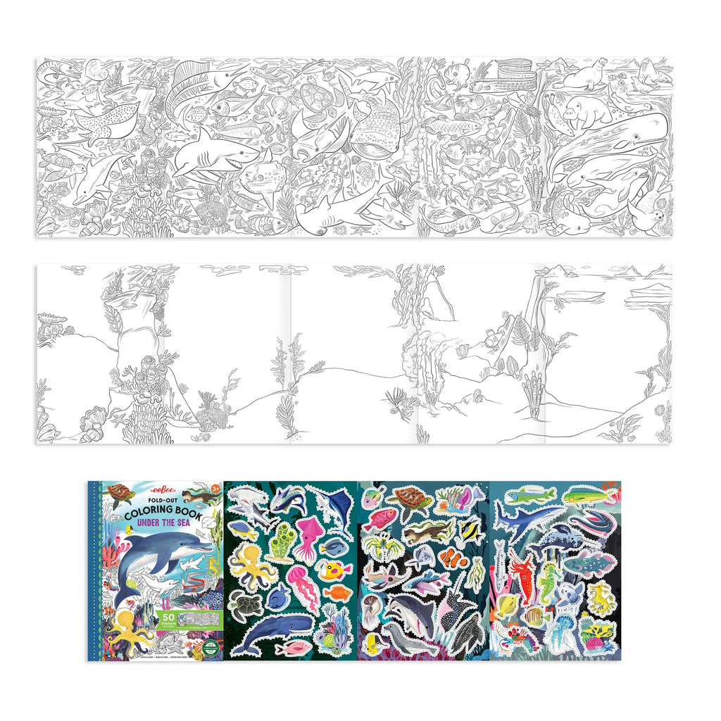 Artist Linda Bleck’s intricate Under the Sea coloring mural folds out for an immersive, oversized coloring experience. A fold-out sheet of vibrant stickers brings the sea creatures to life while the back offers an additional illustrated seascape perfect for coloring and stickering.