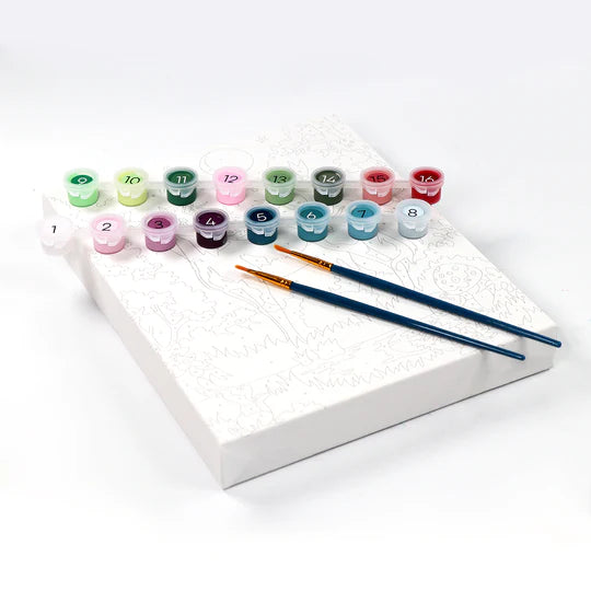 Paint by Numbers featuring beautiful moonlit unicorns in the forest! A classic activity, elevated for kids 8+. Beautiful artwork has enough detail to yield an impressive result. Deep 1.25" canvas can hang or stand, plus 16 colors of paint and 2 brushes for detail. Clever tray pulls out to become your workstation. As always, iHeartArt donates 5% of proceeds to Art Feeds International programs, so kids all over the world can enjoy the nurturing power of creativity.