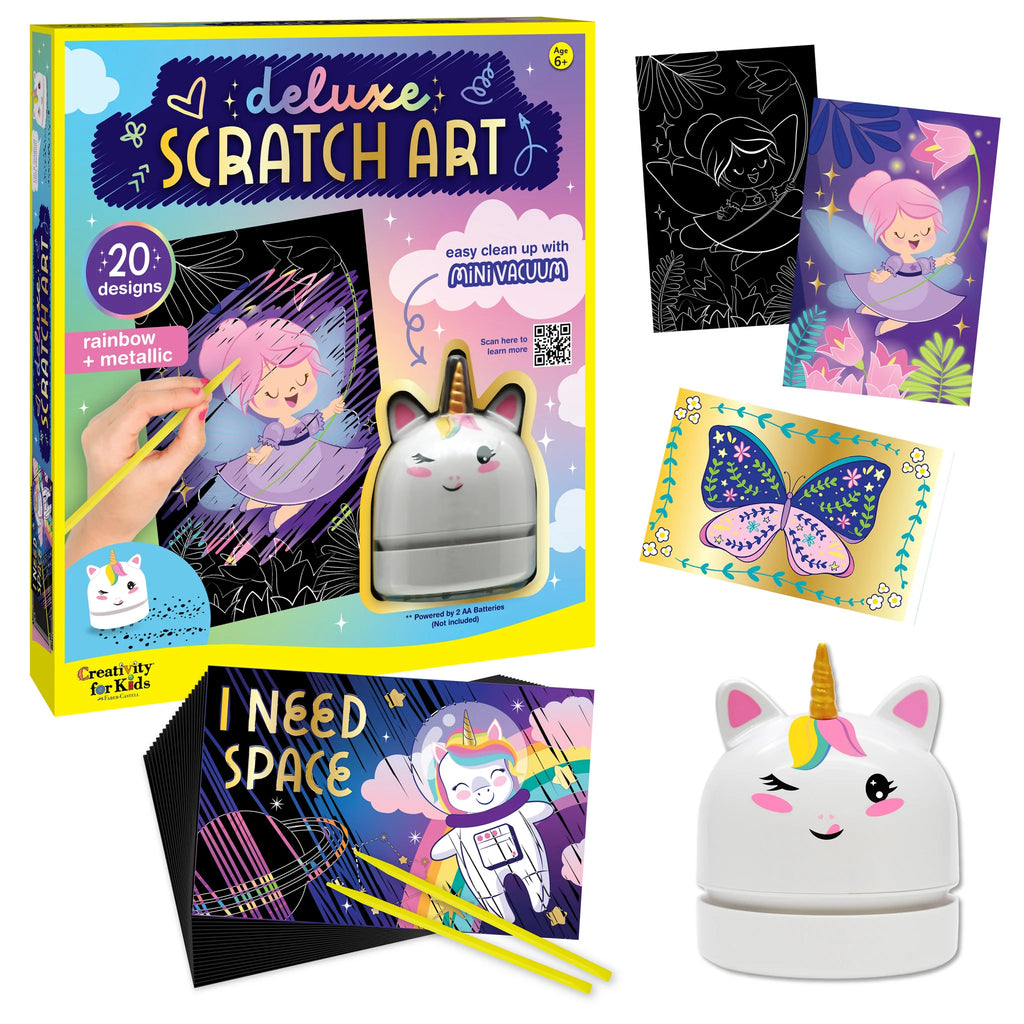 Less mess, more fun! This ultimate scratch art kit includes a mini Unicorn desk vacuum to sweep your crafting crumbs away!