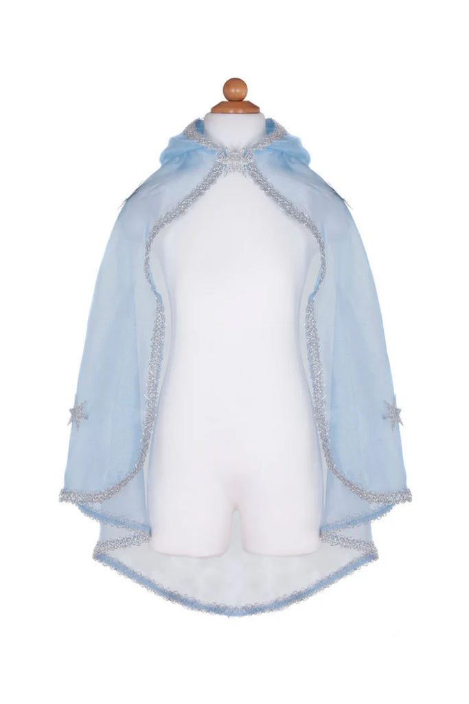 Cast icy spells with our classic Snow Queen Cape. Made from blue crystal organza, this cape features silver glitter sparkle stars, and a large hood. The entire cape is trimmed in silver braided trim for some extra added elegance.