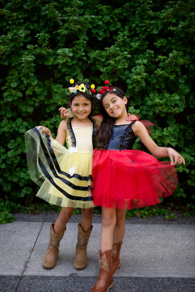 Little ladybugs are sure to fall in love with our new Ladybug Dress & Headband Set. The dress features a black bodice with a red jewel accent and a red tulle skirt with black spots. Also included in the set is a ladybug headband with pom antennae and garden-inspired designs. Pair it with our Ladybug Wings & Headband for a garden-ready look.