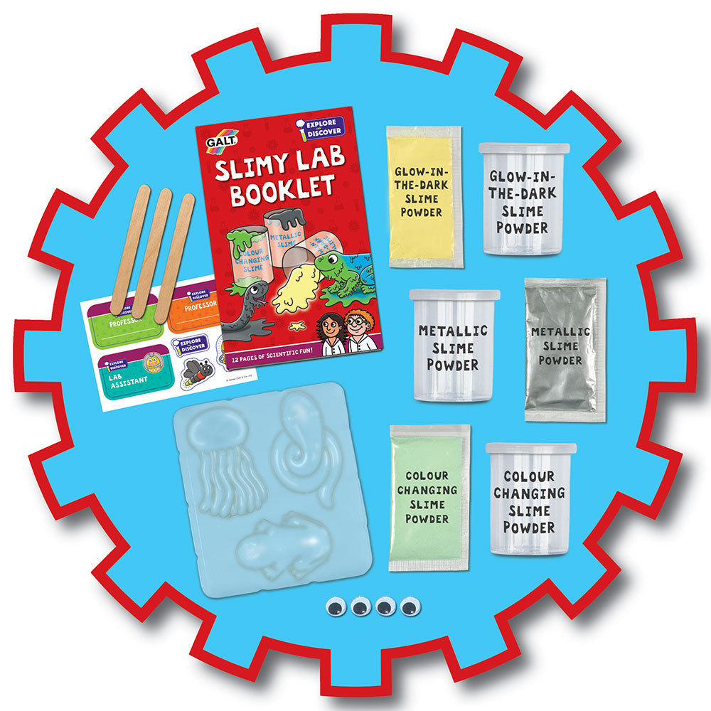 - Contents: make your own glow slime powder, metallic slime powder and colour changing powder with pots, slimy creature mould, 4 wiggly eyes, 3 mixing sticks, stickers and full colour 12-page Lab booklet.