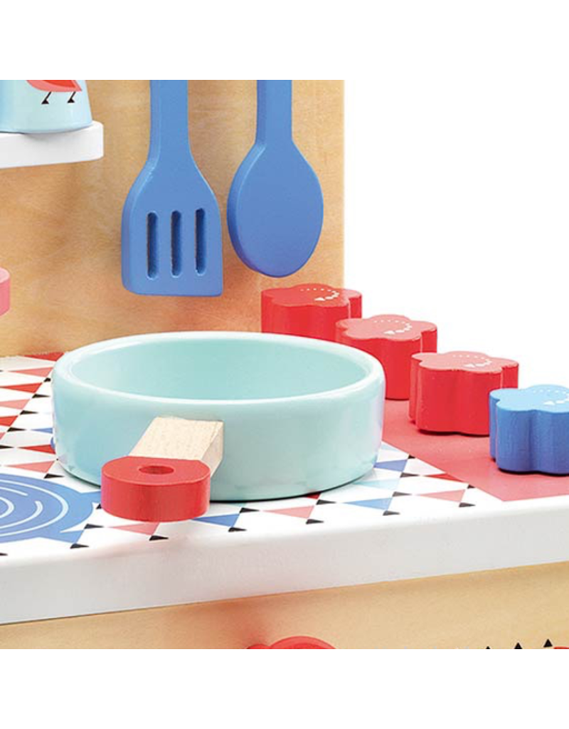 3y+ Your child will cook up a storm in this blue kitchen! This set includes an oven, stove top, pan, pot, spatula, spoon, salt, pepper and cloth. Check the time on the clock, to see if your food ready to serve. An excellent role play toy and perfect for your budding little chef. Requires adult assembly. Designed by Caroline Faup. 37 x 24 x 35cm