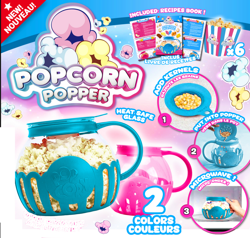 The Popcorn Popper from Groupe Ricochet makes popcorn easy as can be! Simply add kernels to the Popcorn Popper, microwave and enjoy! Includes recipes for caramel, chocolate, cheese and butter popcorn.