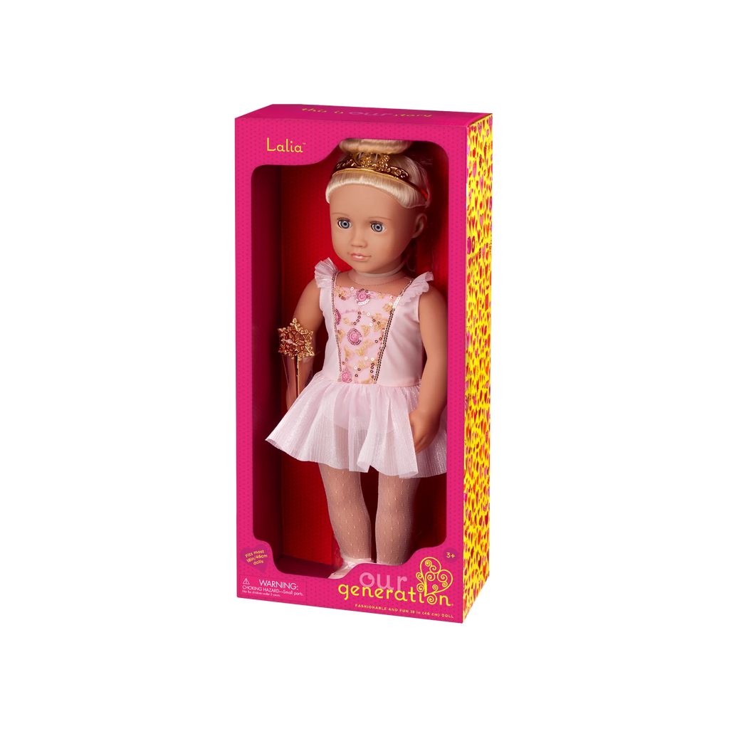 Enter the land of sweets and dream up magical adventures with Our Generation Sugar Plum Fairy Lalia! This enchanting 46 cm doll has lifelike blue eyes that open and close with long blonde hair that's fun to style. She has a huggable soft body and can rotate her neck, arms, and legs to move like a ballerina. Lalia arrives wearing a charming ballet dress with sequin details, a pair of tights, and pink ballet shoes. Plus, her wondrous look comes complete with signature accessories like a golden tiara and a snowflake-themed wand! Lalia's outfit also has easy-open closures for kids to quickly put on and remove. So they can mix, match, and create more cute combos. Our Generation dolls make a great gift for kids ages 3+ (small parts), encouraging them to imagine their own unique stories.