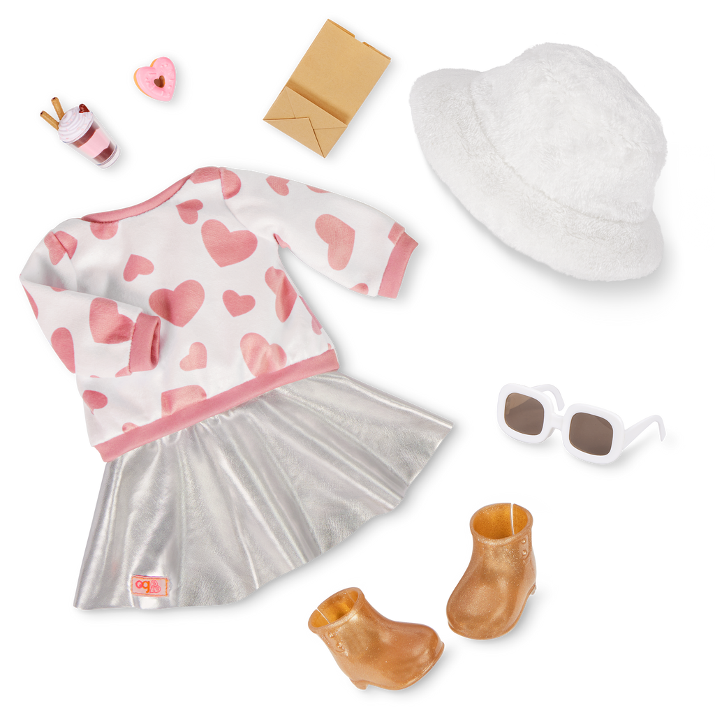 Spread the love with sweets and style! The Our Generation Furry Fun outfit lets kids dress their 18-inch doll in adorable fashion for every playtime adventure. The sweatshirt is decorated with mini pink hearts to give fashion fans a dash of comfort and cuteness. Adding to the fun are a shimmery skirt and trendy bucket hat with sunglasses as kids style their doll bestie from head to toe. Plus, the takeout bag holds a sweet selection of treats, including a donut and drink to expand the storytelling! Our Generation doll clothes make a great gift for kids ages 3+ (small parts), encouraging them to create their own unique stories. Compatible with most 18-inch dolls, doll clothes, and doll accessories to mix and match. Our Generation dolls sold separately.