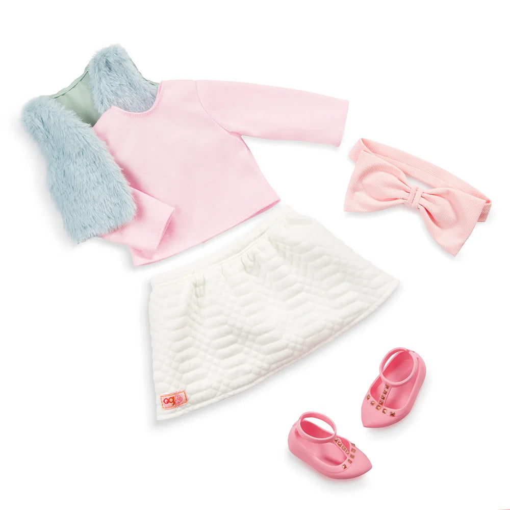 Friendship and fashion shine with Our Generation 46 cm doll Paulina! With trendy pink and blue colours, Paulina is ready for fun in a sweater and skirt outfit. She also wears a faux-fur vest and a cute hair bow for mixing and matching.