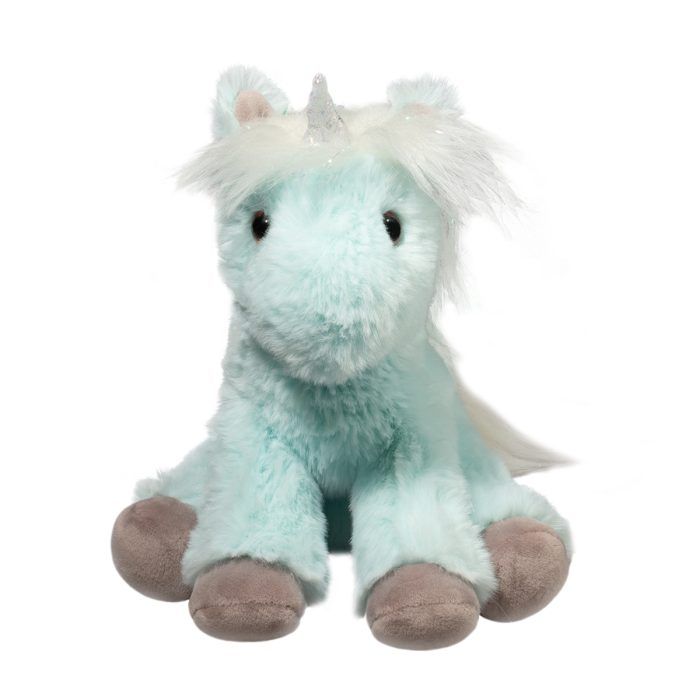 With her appealing pastel color, Bonnie the Mini Soft Ice Blue Unicorn stands out from the herd! As refreshing as a cool springtime breeze, this whimsical fantasy filly will carry your imagination far away to a fairytale kingdom. Bonnie’s aqua colored coat has been fashioned from the most luxurious of plush materials, while a wispy, white mane and tail accent her appearance. Her grey hooves feature a velvety soft texture and are gently weighted for a playful floppy feel. Bonnie’s shimmery Unicorn horn will lead the way to hours of imaginative play, bring home this cuddly companion and let the magic begin!