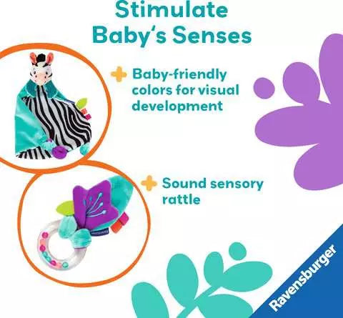 The My First Snuggle Friend Zebra set is a great gift for babies and the soft, snuggly zebra makes a cute first friend. Contrasting colours and different textures including knots, ribbons and fuzzy arms will keep baby entertained as they discover the many multisensory details in the soothing comfort blanket. The My First Snuggle Friend Zebra gift set is complete with an easy-grasp rattle toy and two interlinking rings, which can also be attached to different toys in the Play+ range.