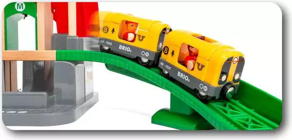 - 33989 Central Station Travel Set includes 37 pieces: 1x Two-level Central Station, 1x Metro Train, 1x Travel Train, 1x Bus, 1x Railway Crossing, 2x Sloping Curved Tracks, 10 x Wooden Tracks and lots of railway accessories.