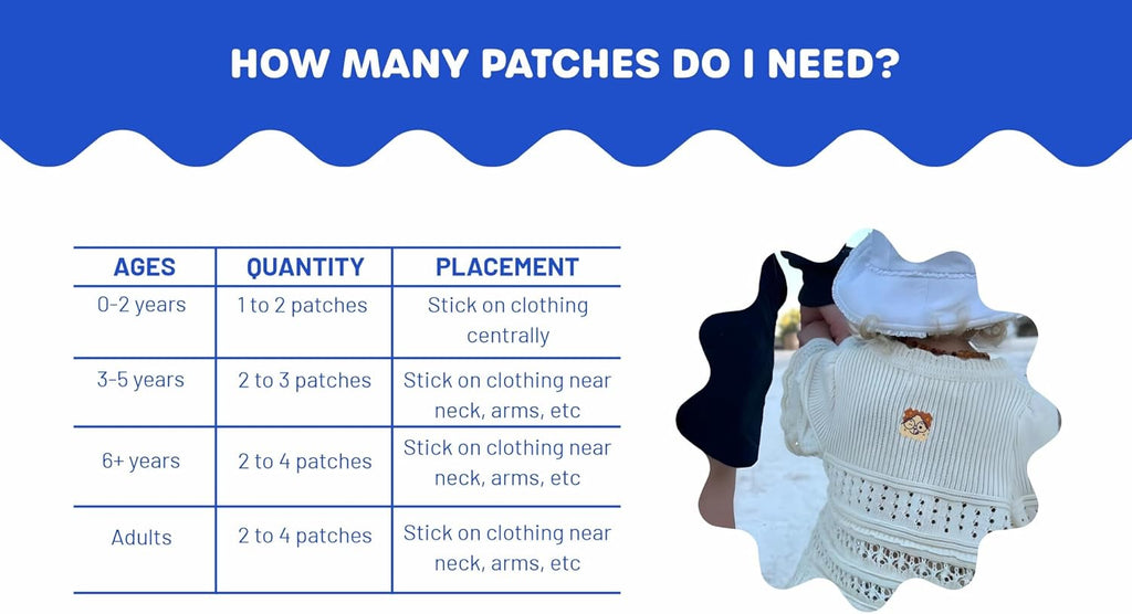 - Kids/Adults aged 6+ need 2-4: One patch on the clothing next to each exposed limb (one on the sleeve of both the left and right arm, and if wearing shorts, one on the left and right side of shorts)