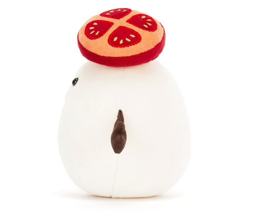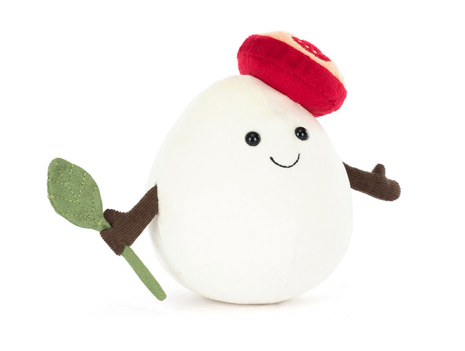 Amuseables Mozzarella is a cuddly Caprese cutie. A soft ball of cream fur, this fromage friend is adorned with a big smile and a chunky slice of textured tomato. With cocoa fine cord arms holding a suedette Basil leaf, this cheese sweetie is the perfect gift for foodie friends and cheese lovers alike!
