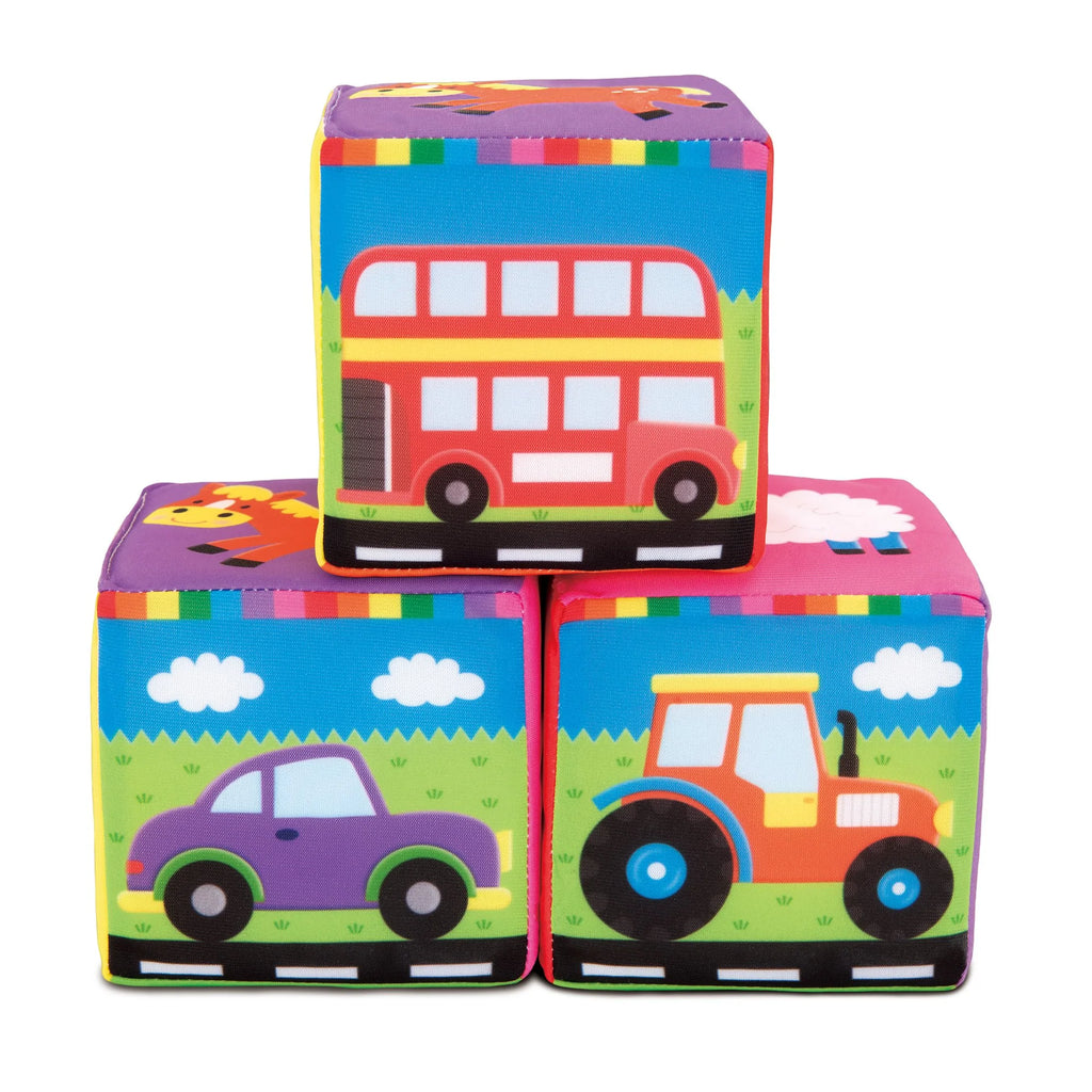 6 foam-filled fabric cubes with colourful animal pictures. Soft and safe, ideal for squeezing, throwing and building. Progress to matching the 12 pairs of animals and joining the animals walking along a path. Machine washable. Awarded 'Recommended' status by the Good Toy Guide. Packed in a PVC bag with carry handle.